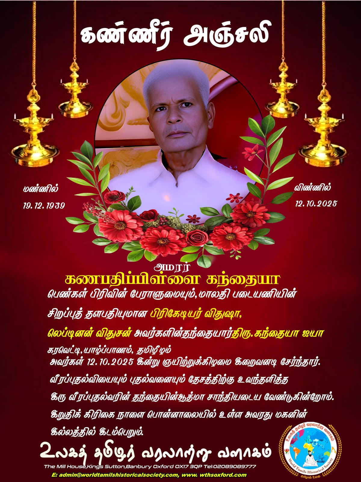 கணவதிப்பிள்ளை கந்தையா. கரவெட்டி யாழில் 12/10/25 இயற்கை எய்தினார் என்பதை அனைத்து தமிமிழீ உறவுகளிற்கும் தெரிவிப்பதோடு எமது இணையம் சார்பாக ஆழ்ந்த இரங்கலையும் இறிதிவணக்கத்தையும் தெரிவித்துக் கொள்கின்றோம்,தேசத்தின் திறல்கள் இருவரைத்தந்த