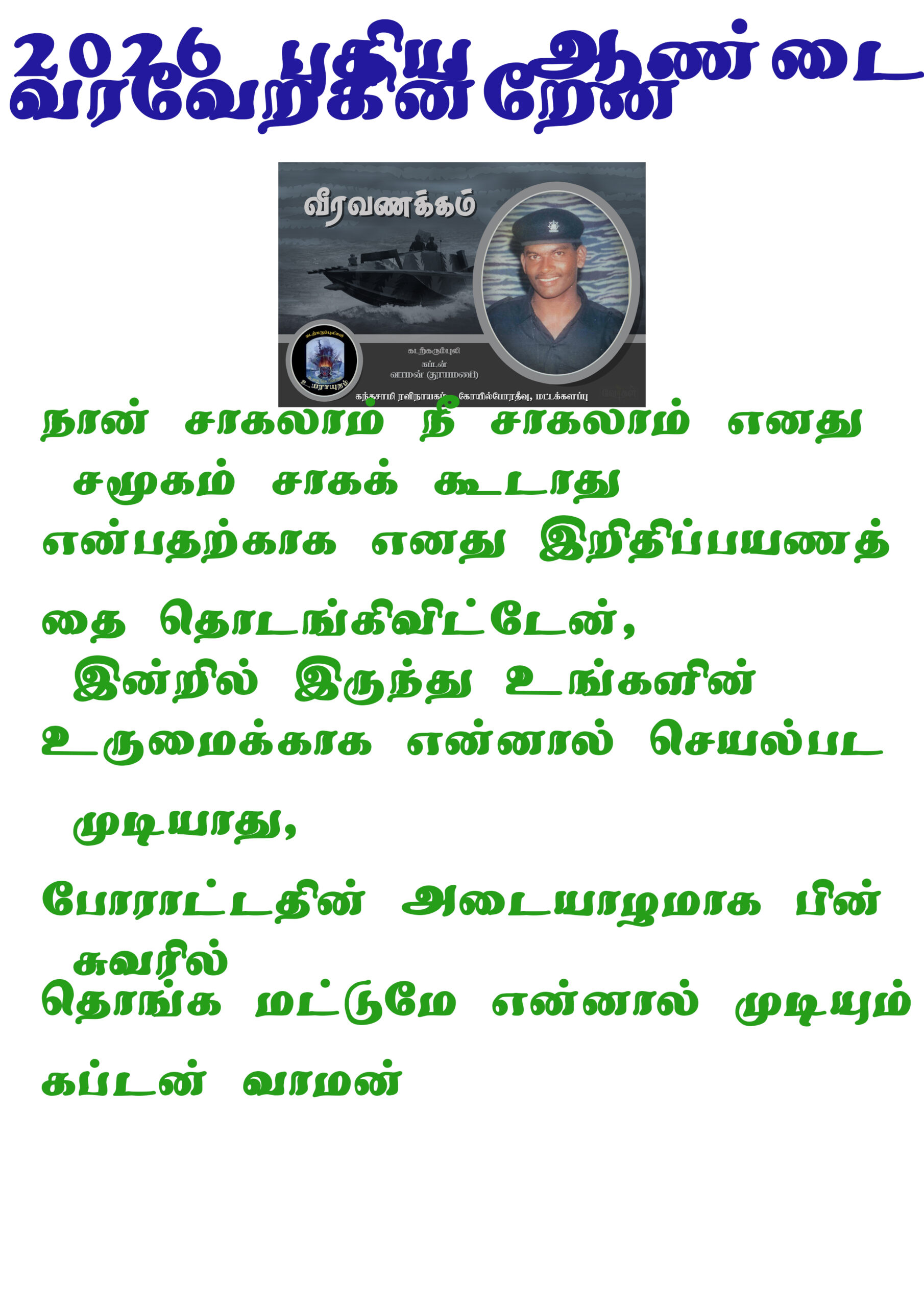 அனைவரின் மனங்களிலும், இன்பமான நிகழ்வுகளும், வெற்றியான நாட்களாகவும் இந்த ஆண்டு அமைய வேண்டும் என தாய் நாட்டின் விடுலைக்காக தங்களை அற்பணித்த மாவீரர்களை வணங்குவோம், எமது செய்தித்தளம் வாழ்த்துகின்றது.